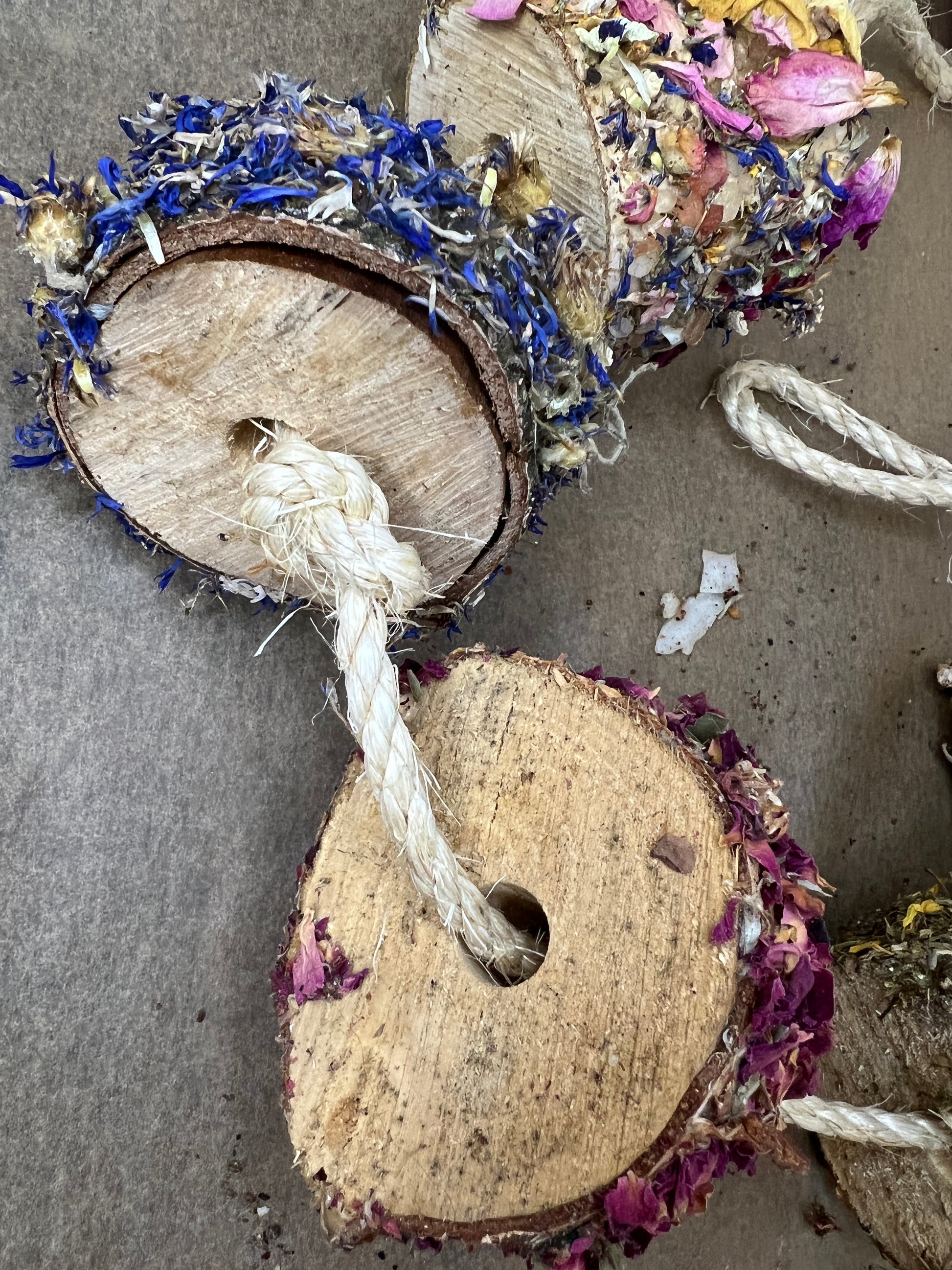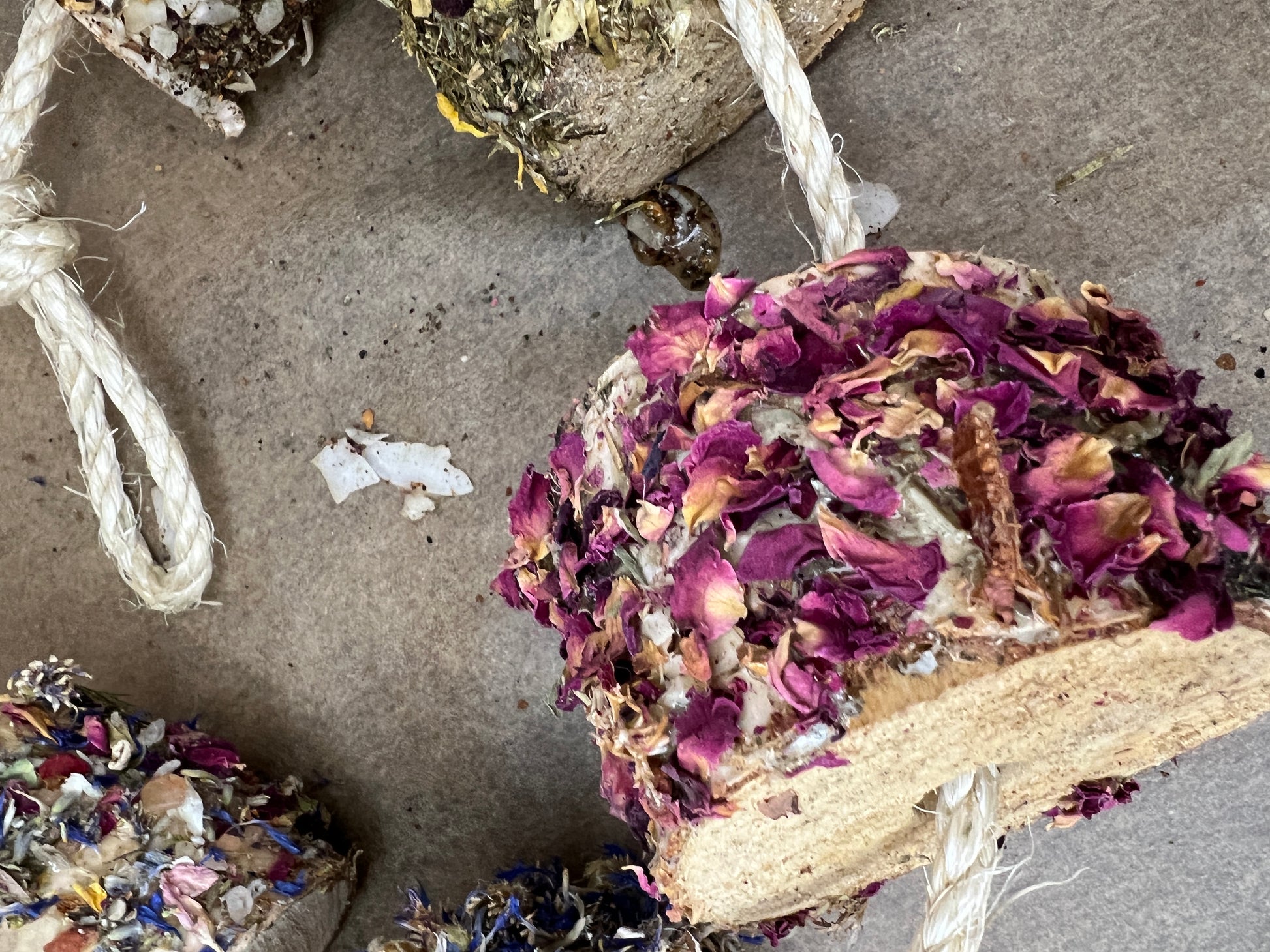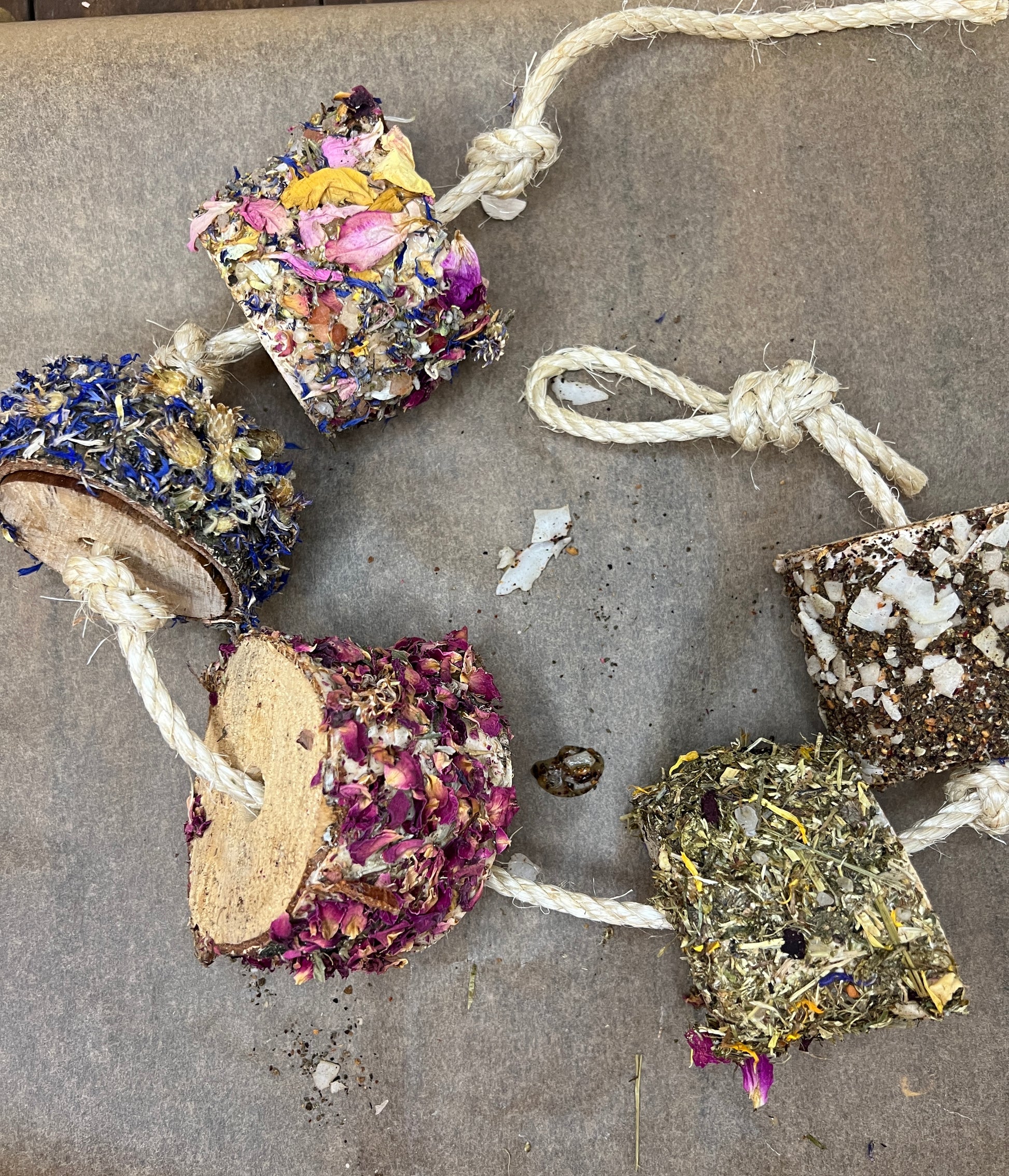 Dieses Set besteht aus 5 kleinen Knabberhölzern mit verschiedenen Geschmacksrichtungen: Kornblume, Blütenmix, Fenchel/Kokos, Rose und Wiesenkräuter. Zusätzlich sind 5 naturbelassene Birkenholzscheiben enthalten, die mit leckeren Leckerlis bestückt sind. Das Produkt wird mit einem Seil geliefert, sodass es einfach aufgebaut werden kann.