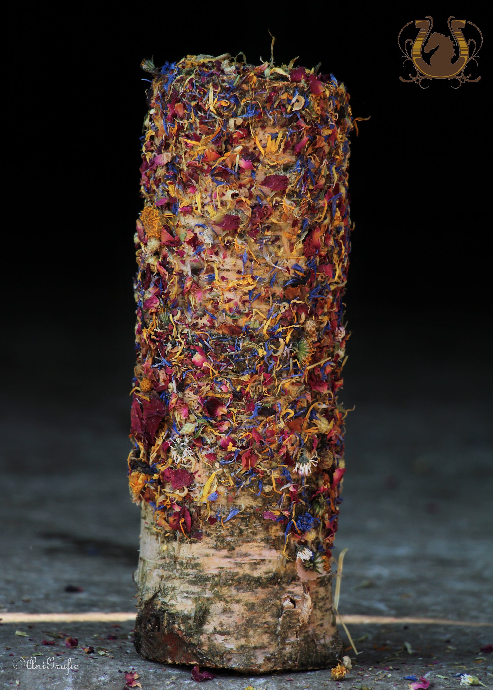 Der Birkenstamm ist etwa 32 cm lang und rund 7 cm dick. Er ist liebevoll mit einer bunten Auswahl an Kräutern und Blüten bestückt, darunter Ringelblumen, Löwenzahnblüten, Kamille, Rosenblätter, Lavendel, Kornblumen und Hibiskusblüten – alles aus eigener Hand gesammelt und sorgfältig getrocknet.