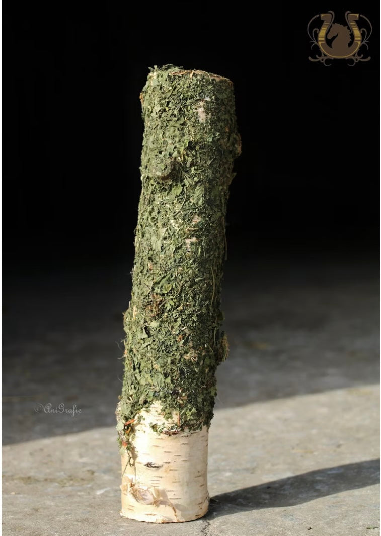 Der Birkenstamm ist ca.32cm lang, ca. 7cm dick und ist bestückt mit Leckerlies.