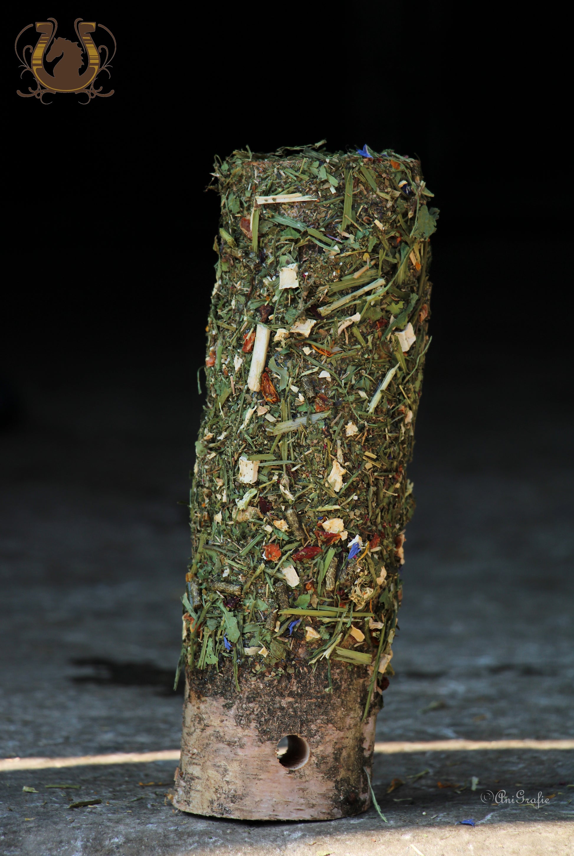 Der Klotz ist innen mit Leckerlies bestückt, die dein Pferd begeistern werden. Bei jeder Lieferung ist außerdem ein Seil dabei, mit dem du den Klotz sicher befestigen kannst.