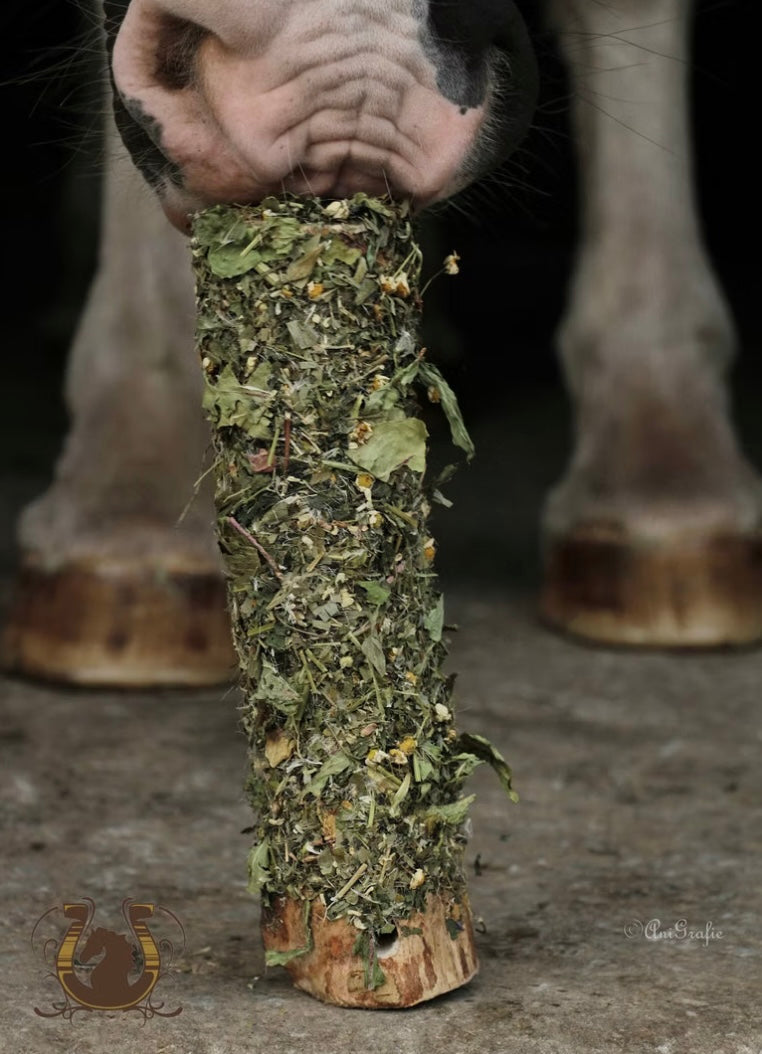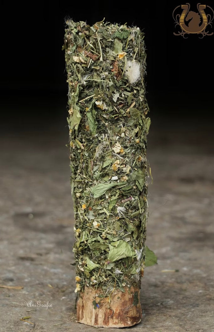 Die Fütterung von Kräutern kann die Behandlung von Hufrehe positiv beeinflussen. Hierfür haben wir extra ein Knabberholz erstellt mit