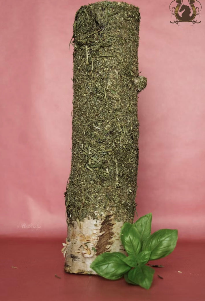 Der Birkenstamm ist ca.32cm lang, ca. 7cm dick und ist bestückt mit Leckerlies
