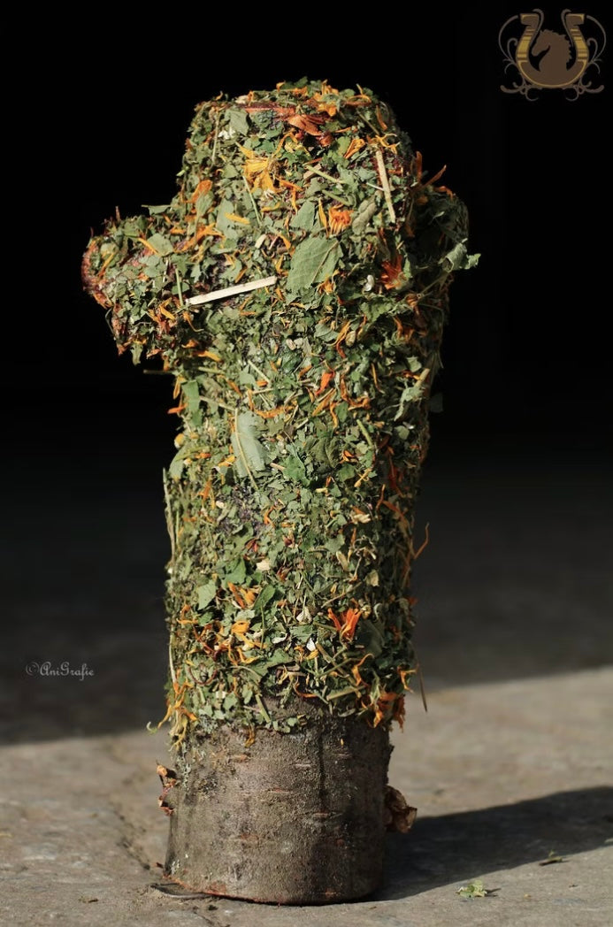 Der Kirschstamm ist ca. 32 cm lang, ca. 7 cm dick und ist bestückt mit Leckerlies.
