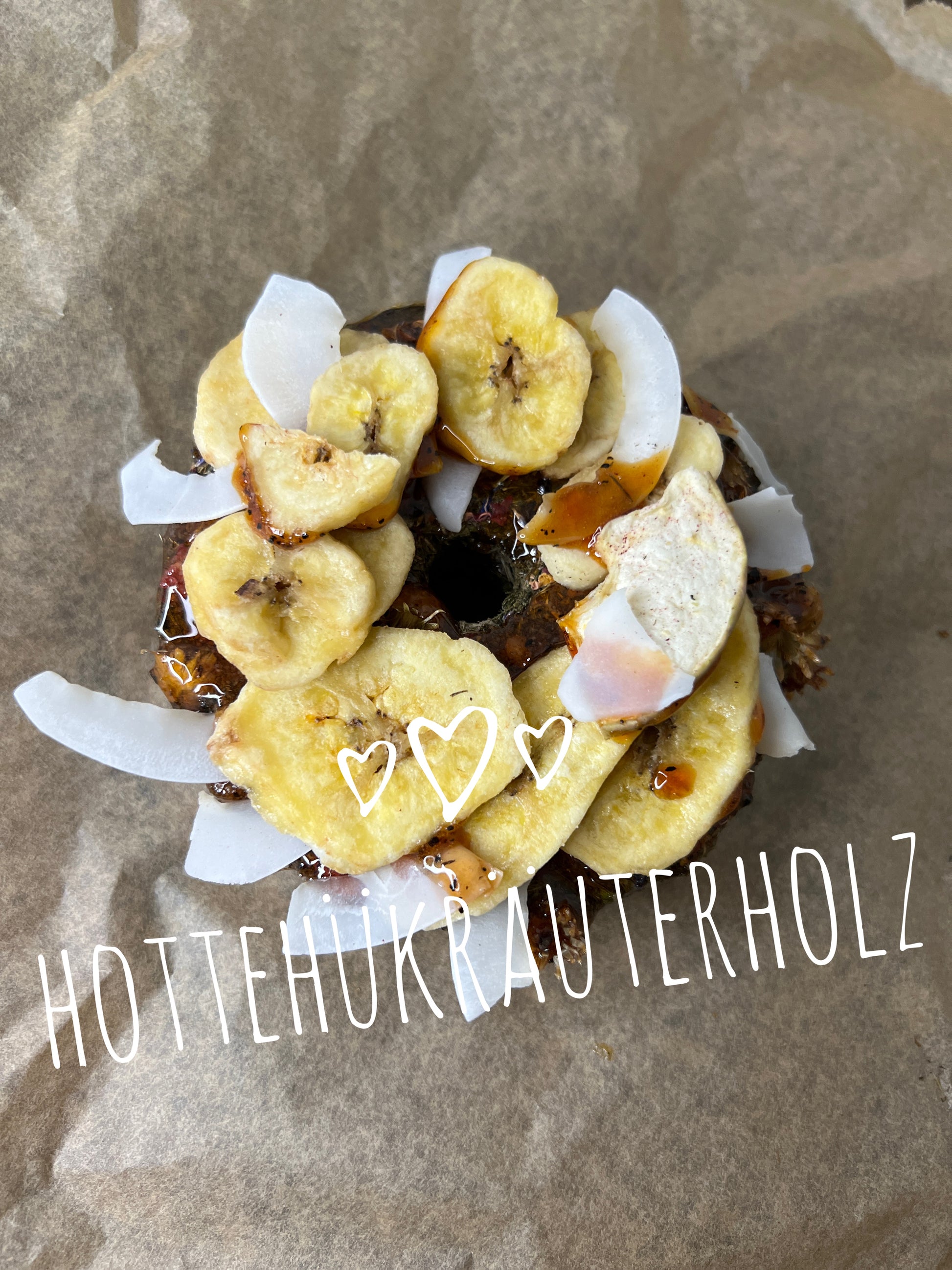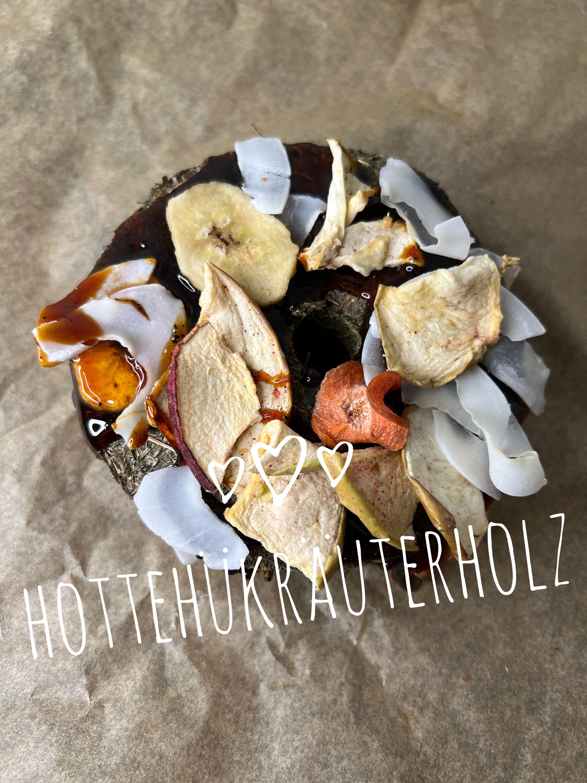 Diese Scheiben haben einen Kräuter- und Blumenkern. Die Ummantelung besteht aus unserer zuckerfreien Waldbeerlasur und das Topping besteht aus Banane, Apfel, Kokos und Möhre.